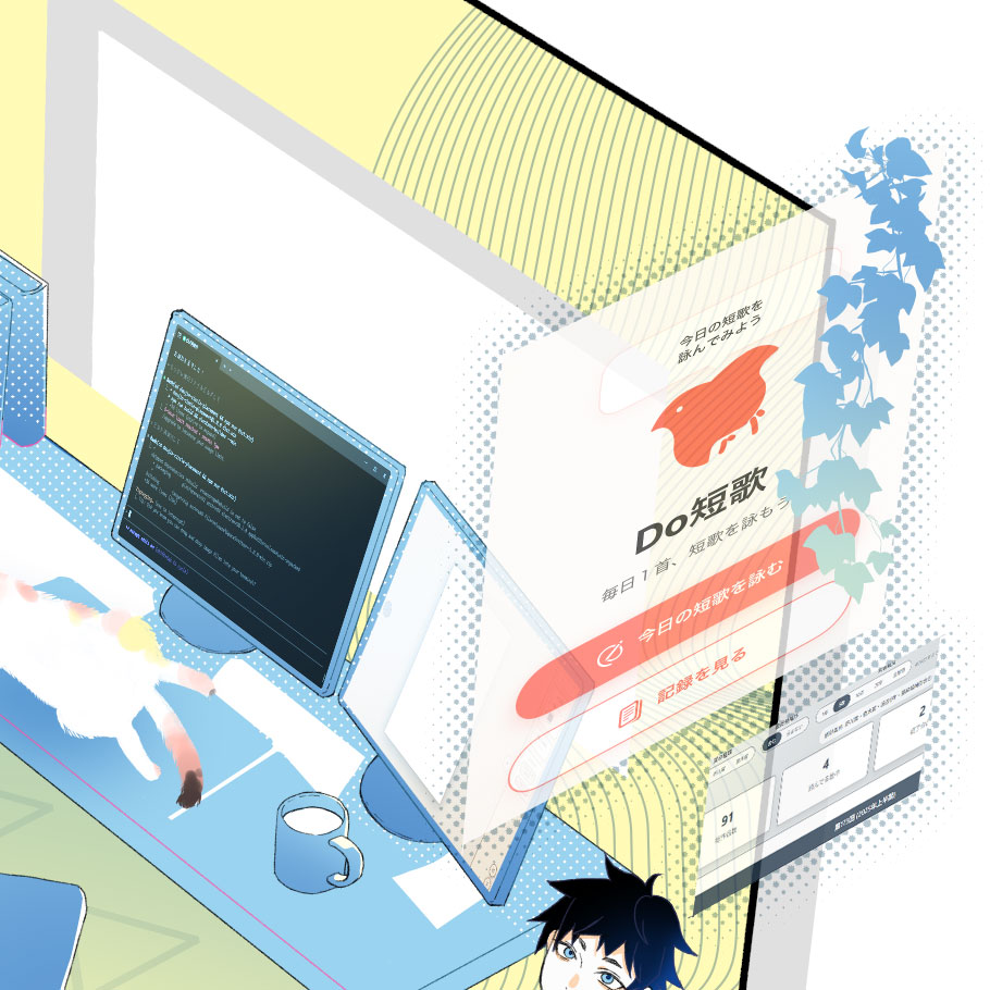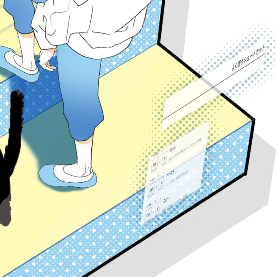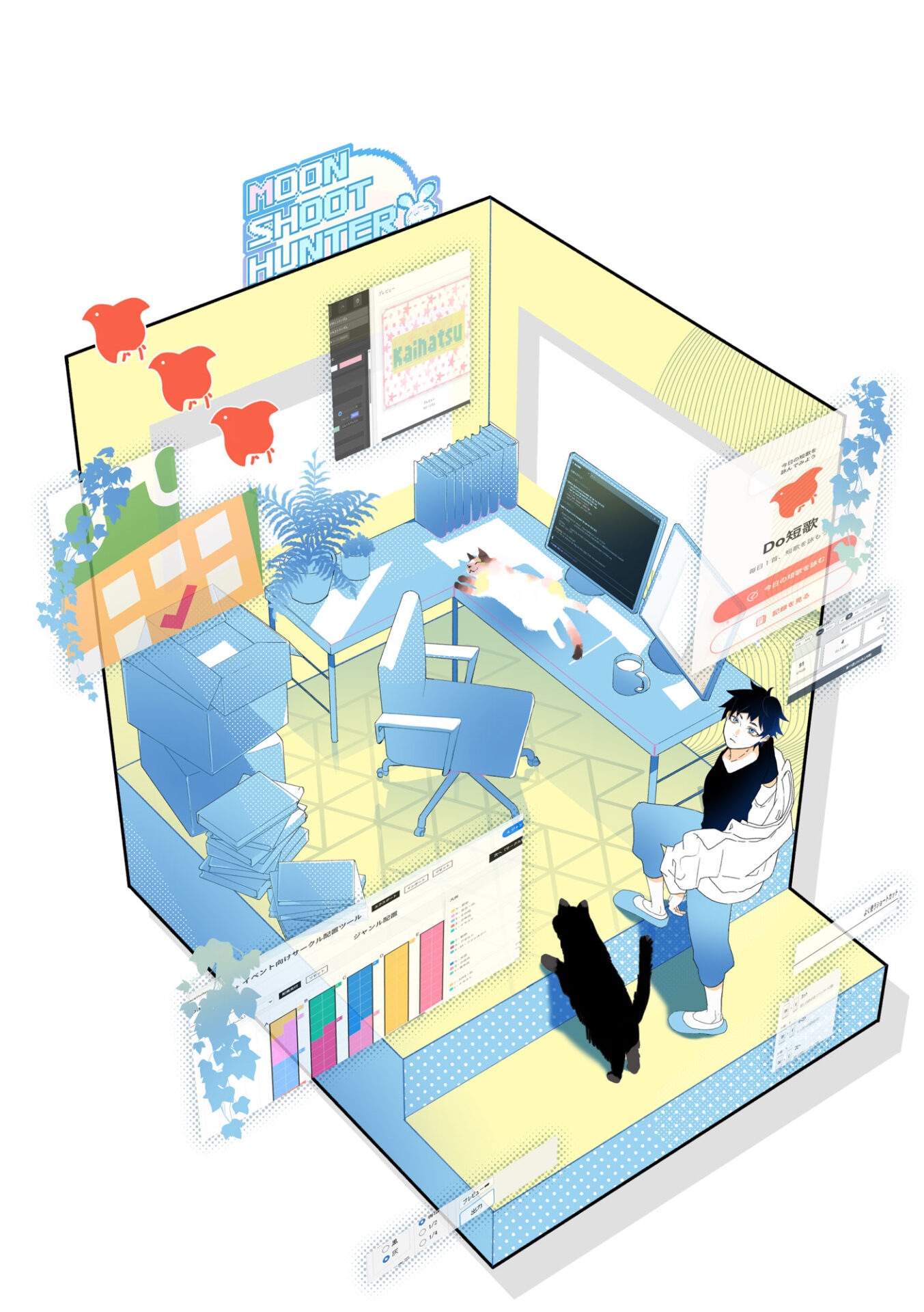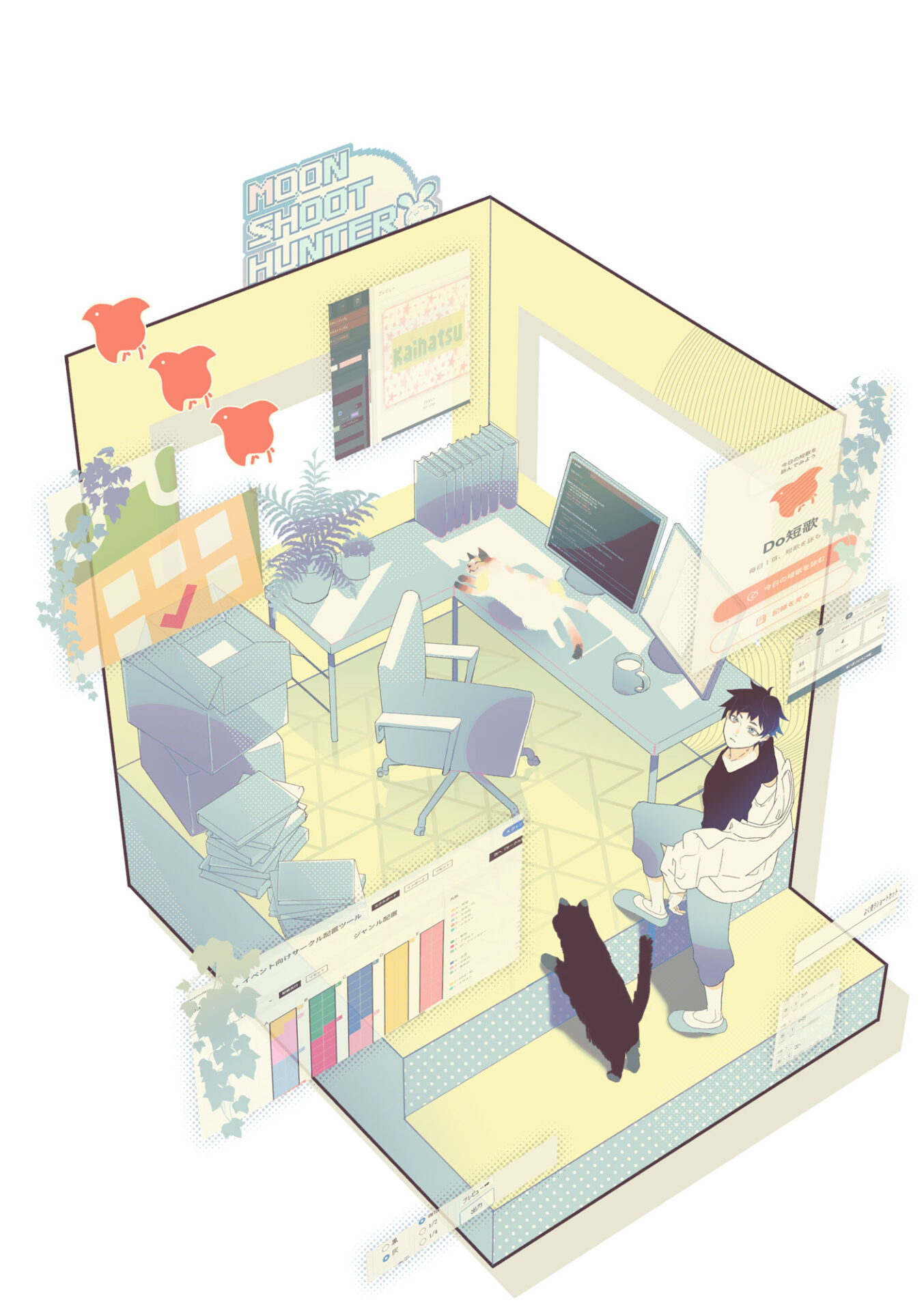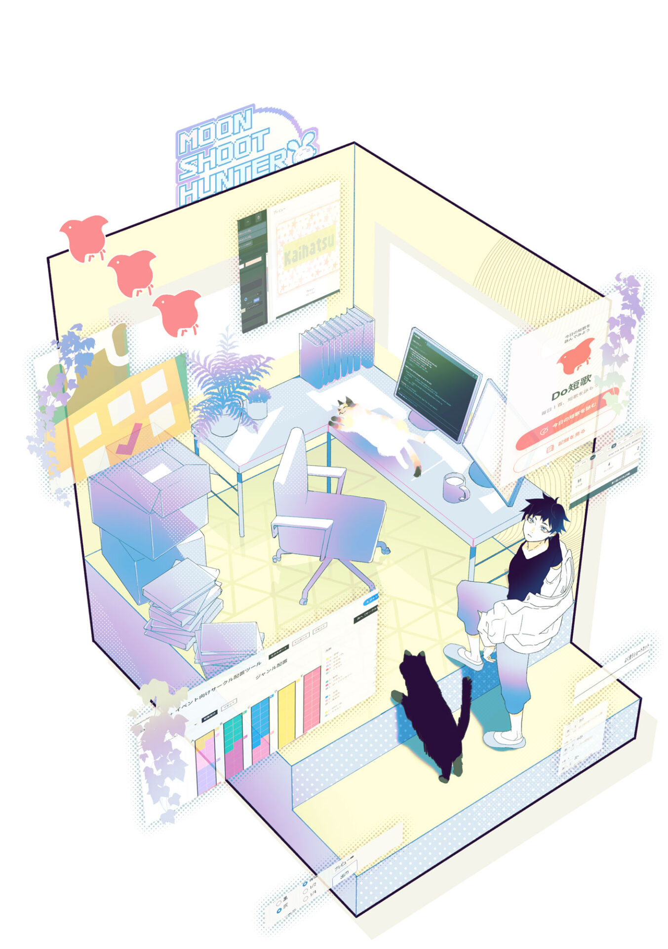 浮いている窓やモニターなどには開発アプリのイメージを乗せられたら楽しいな、アプリイメージが目立つようにベースの色数はあまり増やしたくないなということで基本的な色合いは黄+青+白黒で出来るだけシンプルになるように心がけてました。