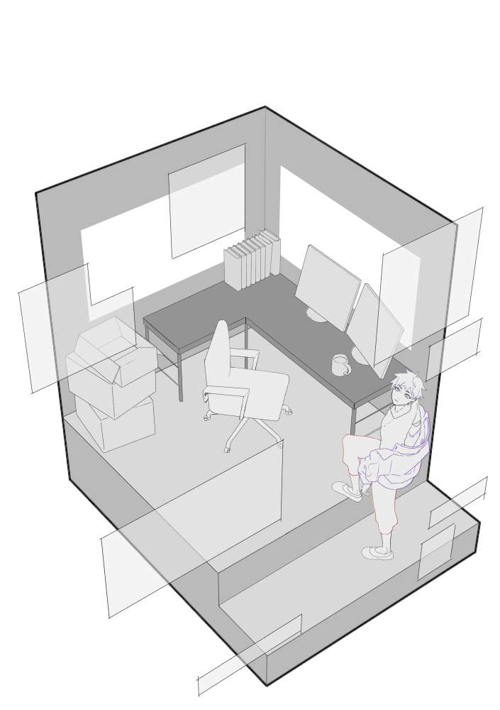 一度立方体を置くと自動的にパース定規が出来上がるので、定規を頼りに机や諸々の内装を整えていきます。