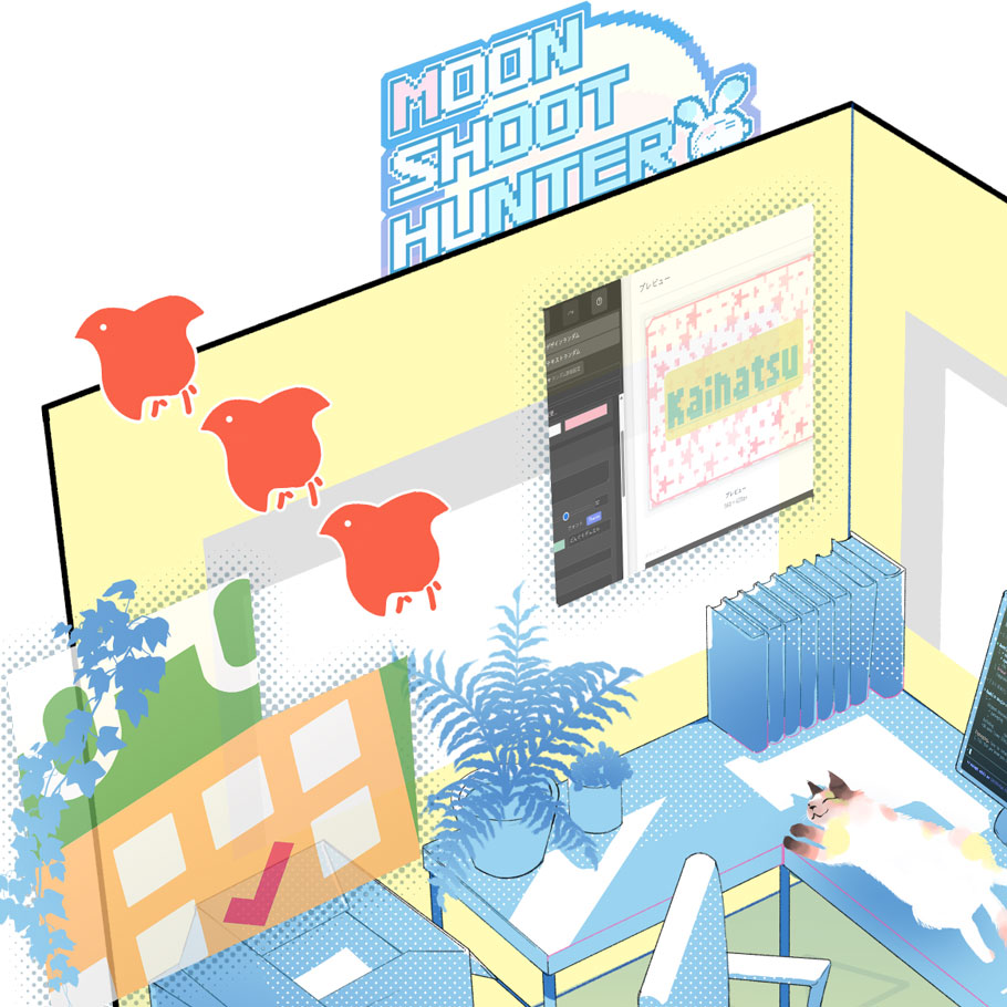 Do短歌の小鳥ちゃんがフォトジェニックでとても可愛かったので、アプリ画面からも飛び立ってもらっています。MOON SHOOT HUNTERロゴのウサギさんも存在感がとても良いですね。