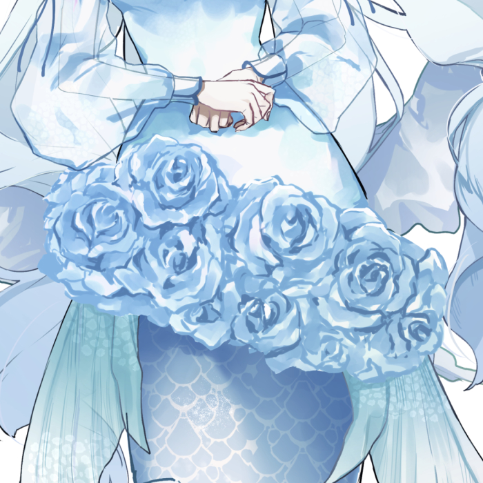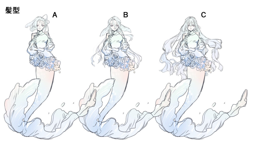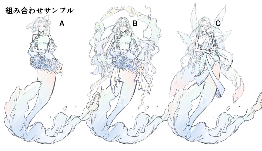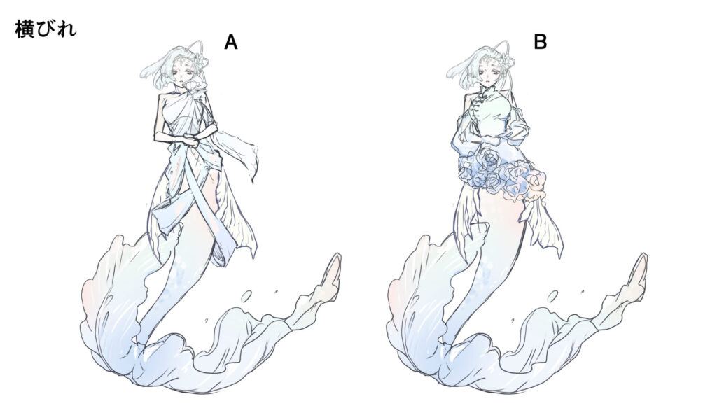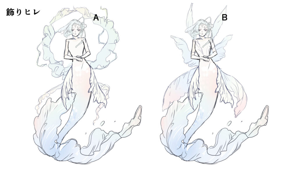 膨らんで透ける袖や斜め下にひらひら揺れていくリボン状のヒレはまんまクラゲをイメージしていました。優美で良いですよね、クラゲの触手。