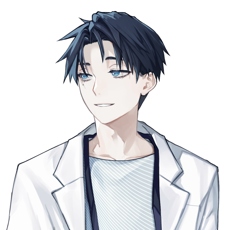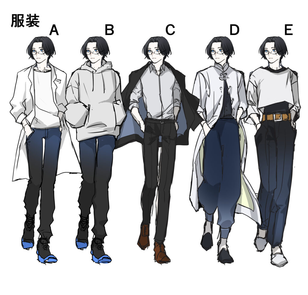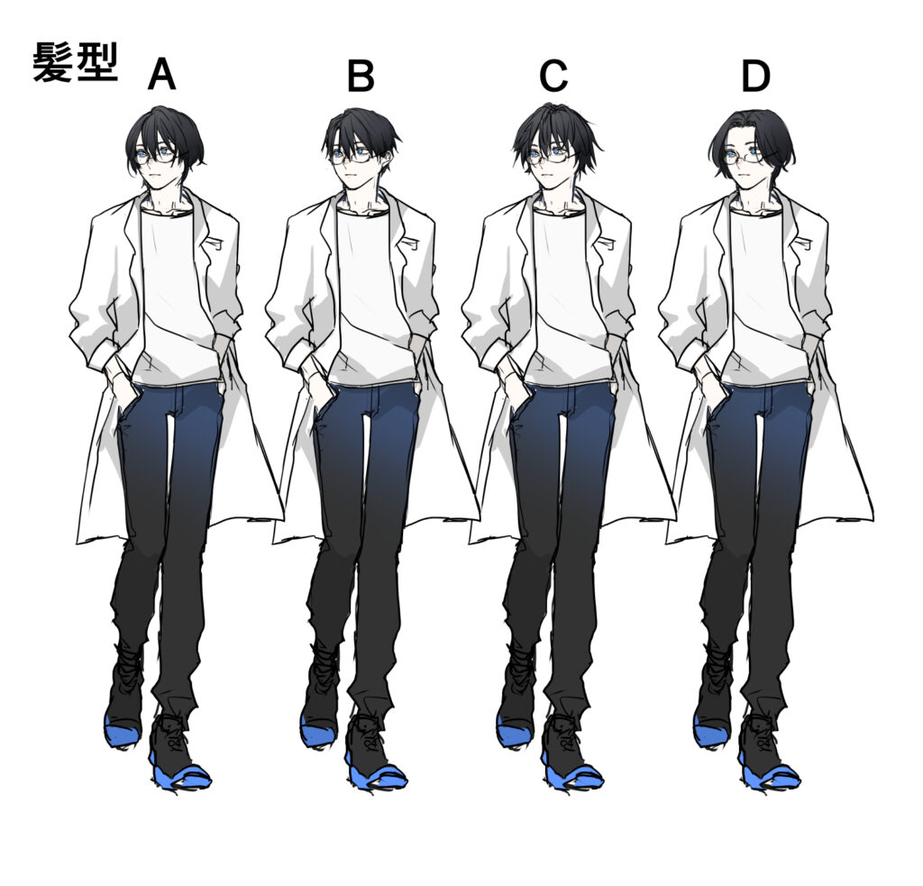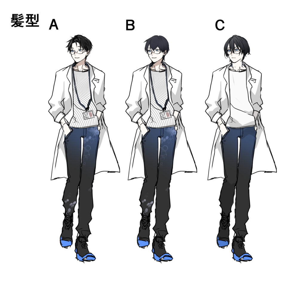 服装イメージとしては、なるべく近未来的にしつつ時代幅を大きく取れそうなもの、あとはシチュエーションとして合っていそうな白衣ベースとなりました。