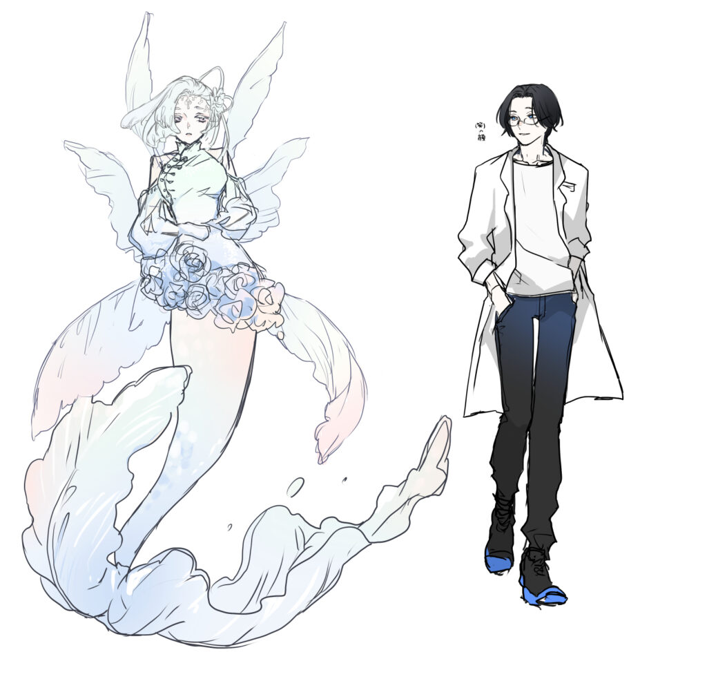 もっと大元のラフはクロッキー帳にあるんですが、背びれ部分を羽根や羽衣に見立てて広げられないかと模索した形跡があります。