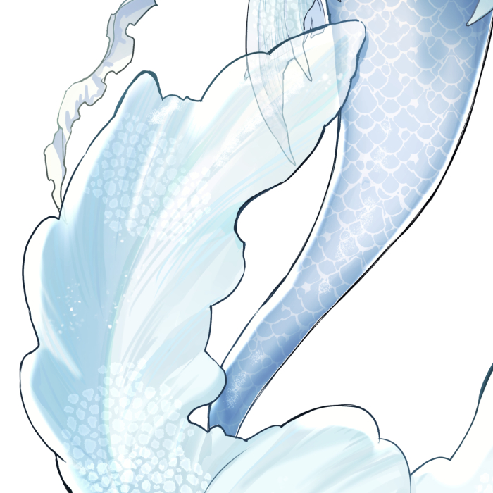 鰭の泡沫みたいな効果は「鱗ブラシ」、下半身の鱗は描いたものを貼り合わせて作っています。