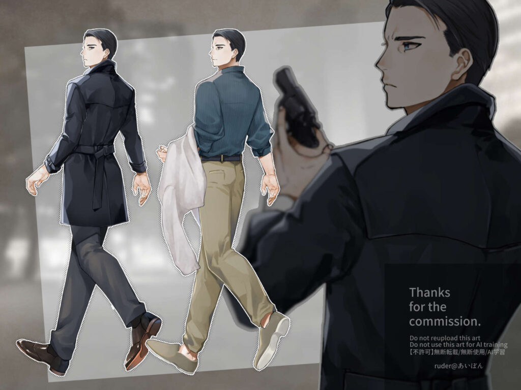 - トレンチコートと後ろ姿【立ち絵制作の話】TRPG用PCさんの立ち絵を描かせていただきました! がっしりめの刑事さんを描かせていただきました!トレンチコートと私服、戦闘用差分+表情差分と色々組み合わせていただけそうな内容になったのでは!と!思います! 出来上がり …